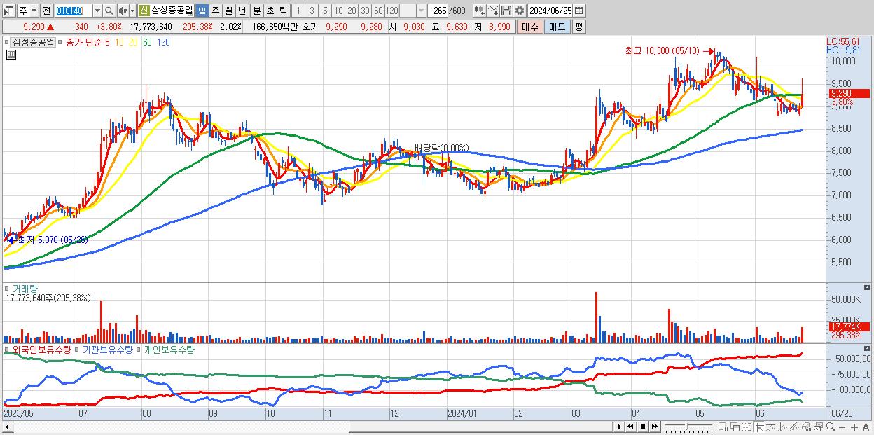 - 삼성중공업 (9,290원 ▲ 3.8% , 시총: 81,752억, 거래량: 17,773,640, 거래대금:1,666억)