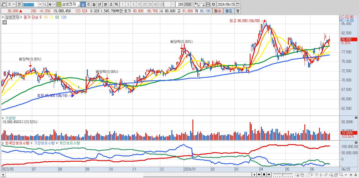 - 삼성전자 (80,800원 ▲ 0.25% , 시총: 4,823,584억, 거래량: 19,088,458, 거래대금:15,458억)