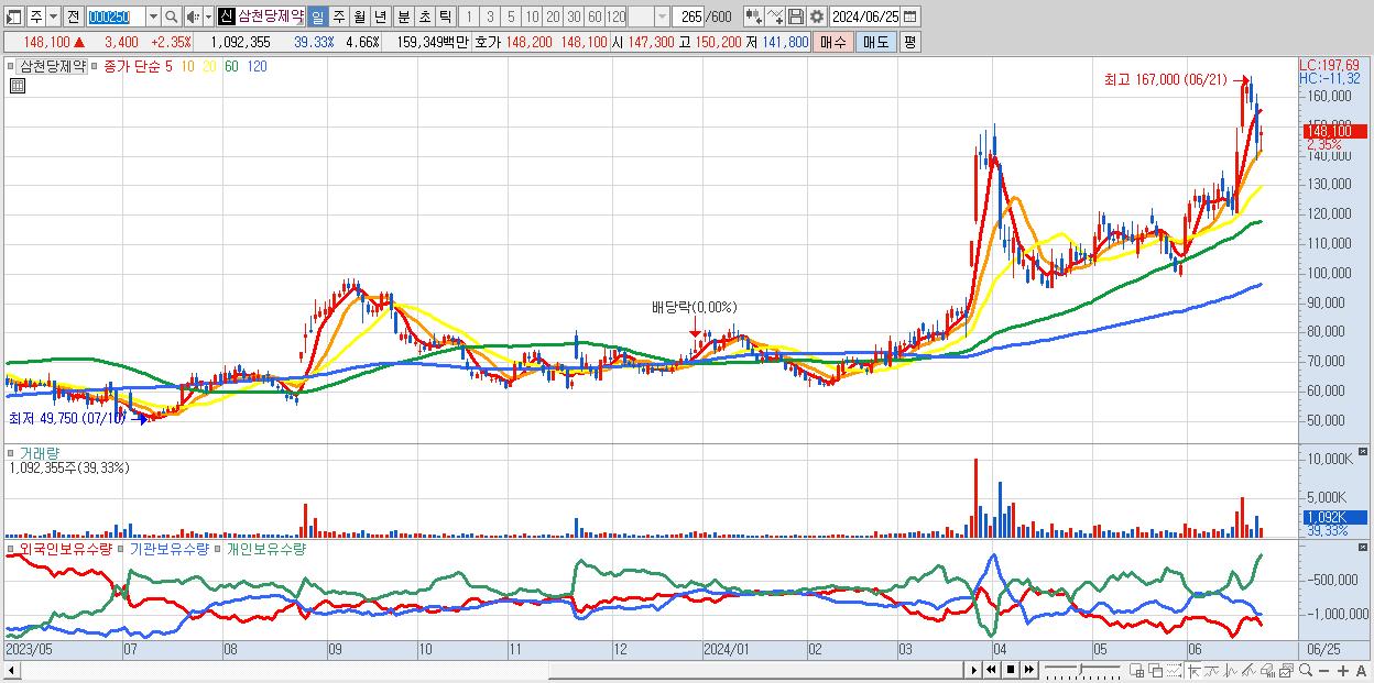 - 삼천당제약 (148,100원 ▲ 2.35% , 시총: 34,741억, 거래량: 1,092,355, 거래대금:1,593억)