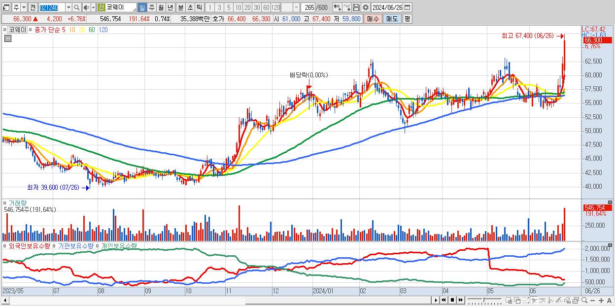 - 코웨이 (66,300원 ▲ 6.76% , 시총: 48,929억, 거래량: 546,754, 거래대금:354억, KOSPI)