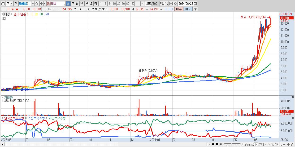 - 태성 (13,940원 ▲ 9.33% , 시총: 3,599억, 거래량: 1,853,616, 거래대금:250억, KOSDAQ)
