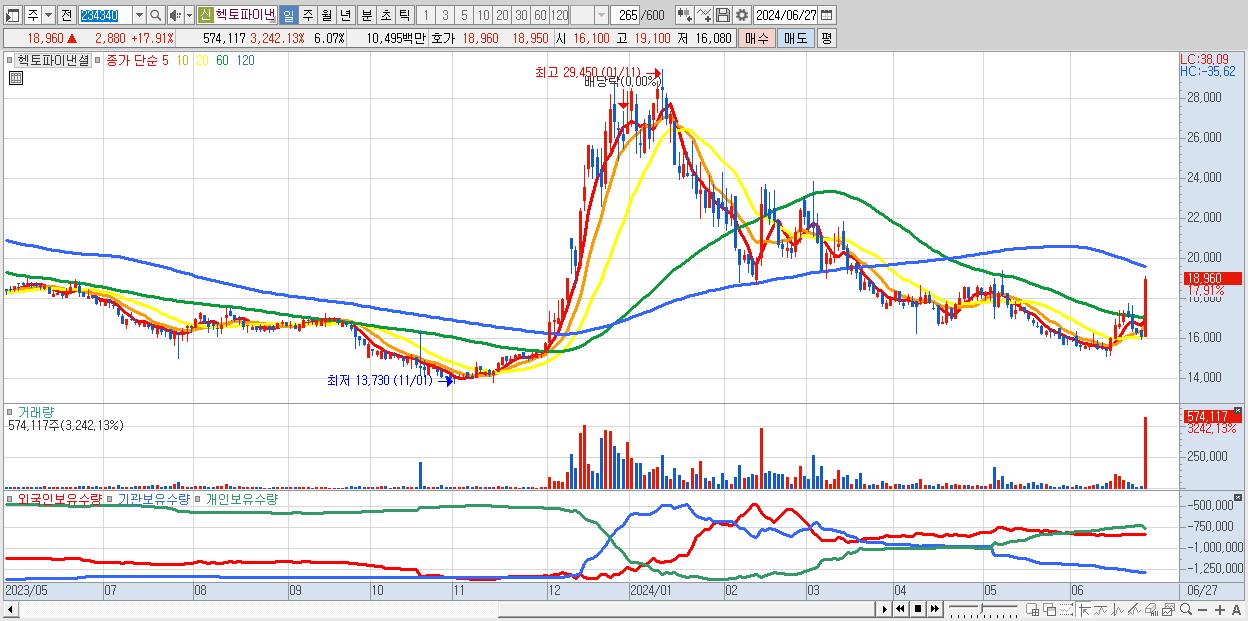 - 헥토파이낸셜 (18,960원 ▲ 17.91% , 시총: 1,792억, 거래량: 574,117, 거래대금:105억)