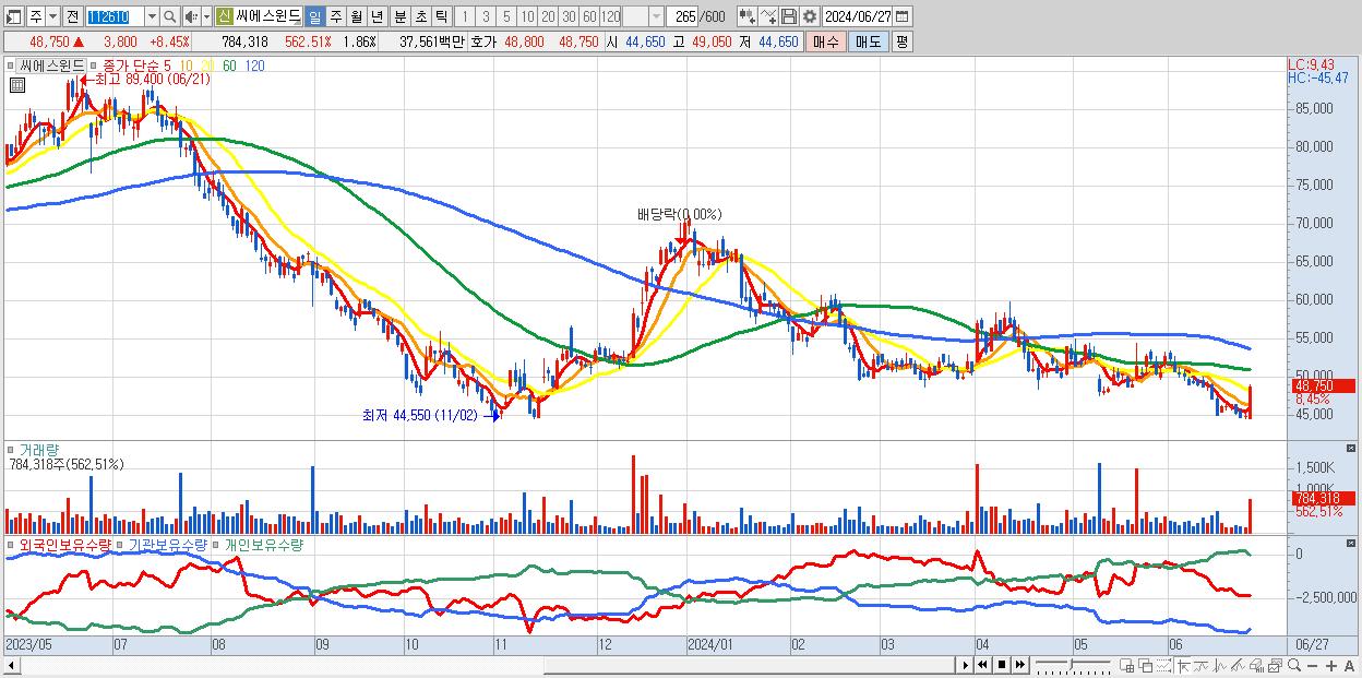 - 씨에스윈드 (48,750원 ▲ 8.45% , 시총: 20,559억, 거래량: 784,318, 거래대금:376억)