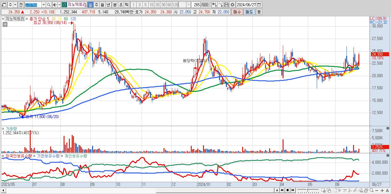 - 지노믹트리 (24,350원 ▲ 10.18% , 시총: 5,932억, 거래량: 1,252,344, 거래대금:297억)