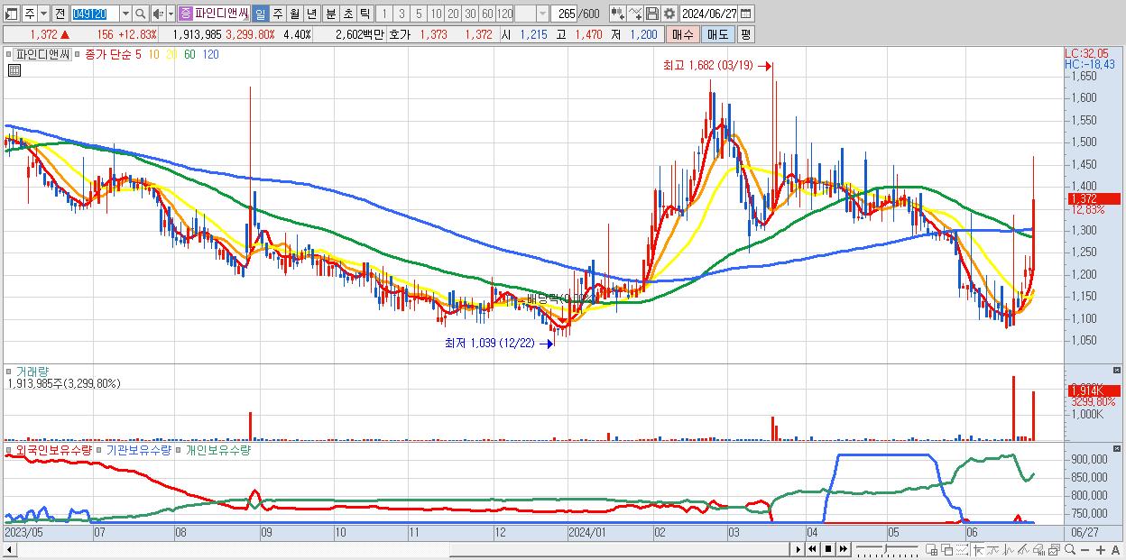 - 파인디앤씨 (1,372원 ▲ 12.83% , 시총: 597억, 거래량: 1,913,985, 거래대금:26억)