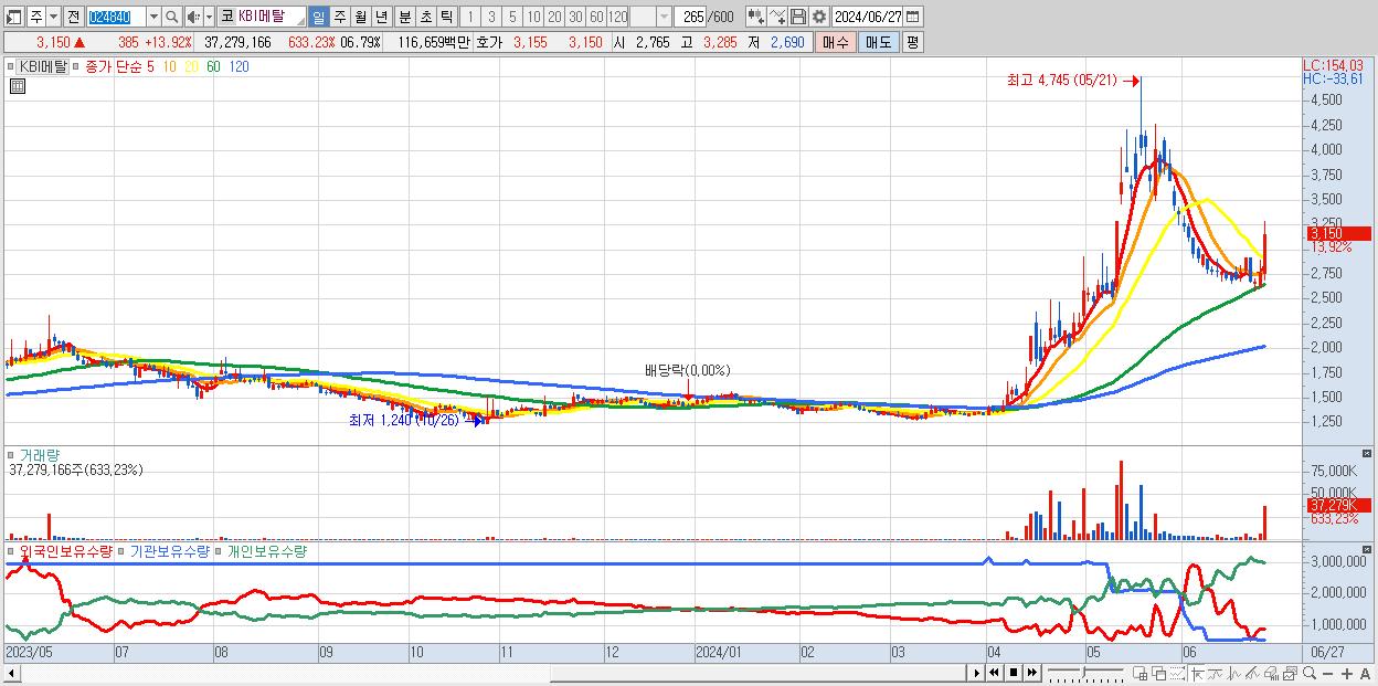 - KBI메탈 (3,150원 ▲ 13.92% , 시총: 1,100억, 거래량: 37,279,166, 거래대금:1,167억)