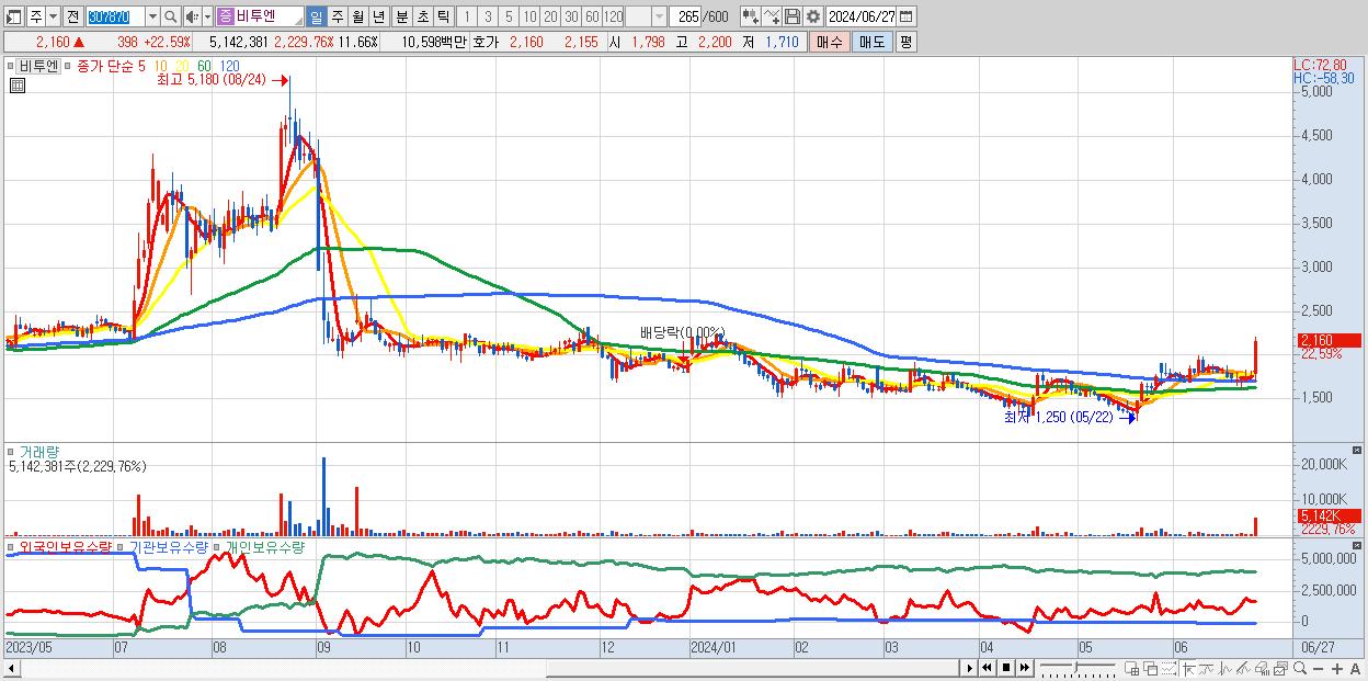 - 비투엔 (2,160원 ▲ 22.59% , 시총: 953억, 거래량: 5,142,381, 거래대금:106억)