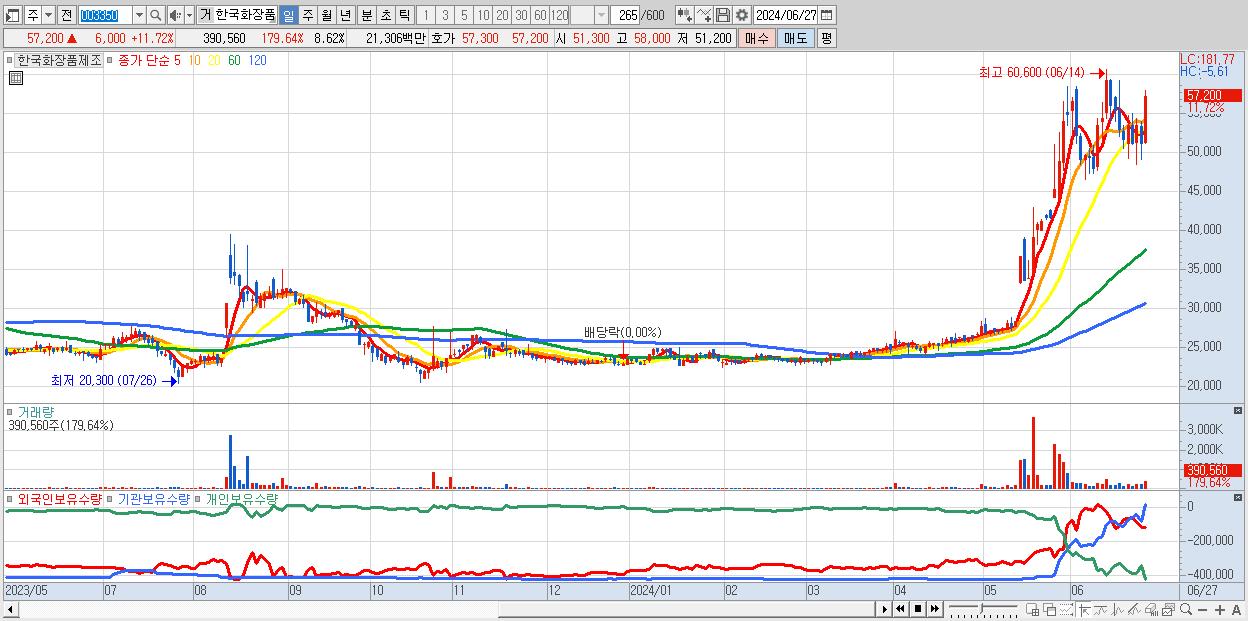 - 한국화장품제조 (57,200원 ▲ 11.72% , 시총: 2,592억, 거래량: 390,560, 거래대금:213억)