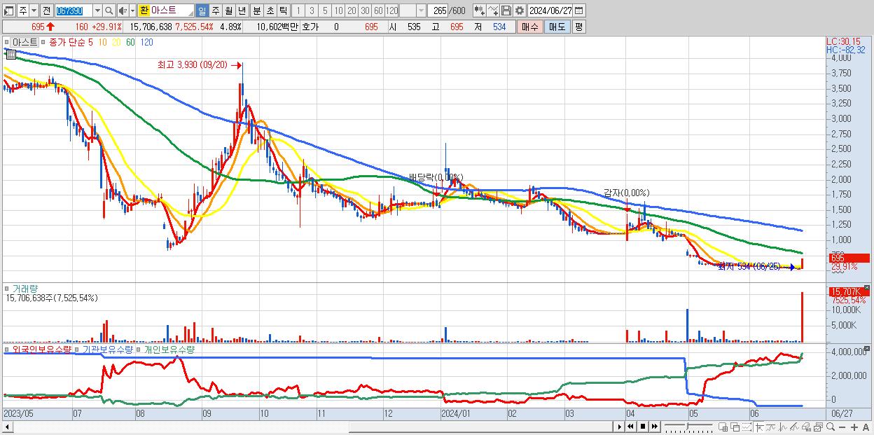- 아스트 (695원 ▲ 29.91% , 시총: 2,233억, 거래량: 15,706,638, 거래대금:106억)