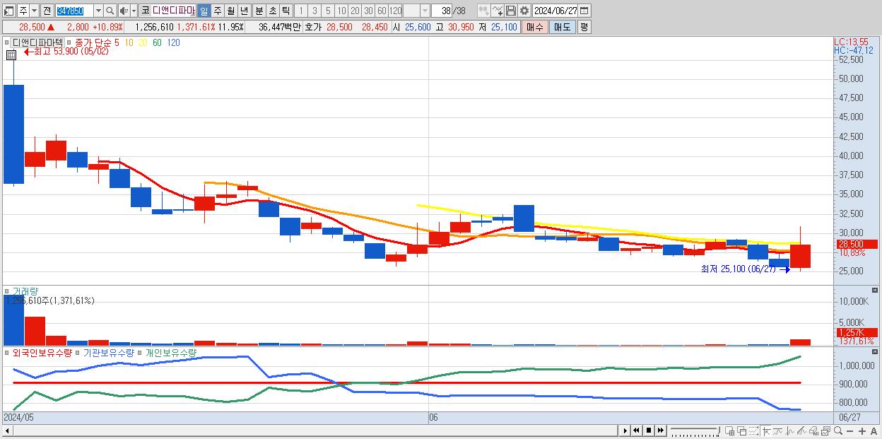 - 디앤디파마텍 (28,500원 ▲ 10.89% , 시총: 2,997억, 거래량: 1,256,610, 거래대금:364억)
