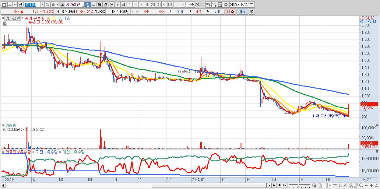 - 기가레인 (883원 ▲ 24.02% , 시총: 750억, 거래량: 20,823,659, 거래대금:181억)