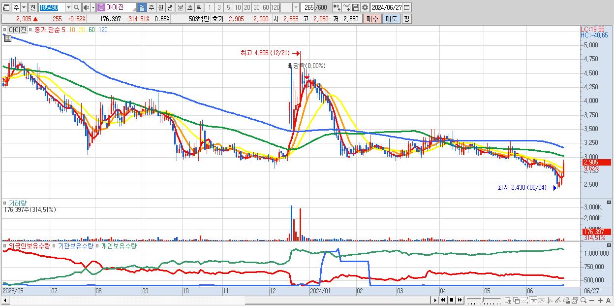 - 아이진 (2,905원 ▲ 9.62% , 시총: 785억, 거래량: 176,397, 거래대금:5억)
