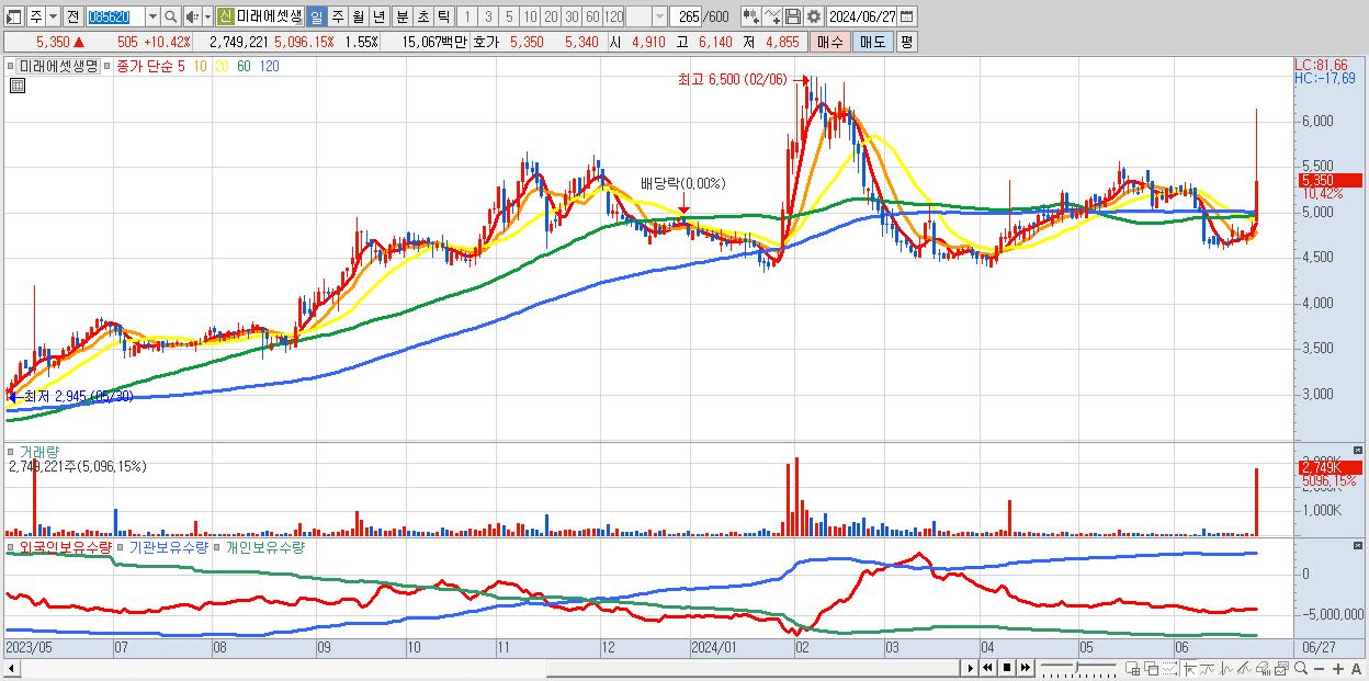 - 미래에셋생명 (5,350원 ▲ 10.42% , 시총: 9,470억, 거래량: 2,749,221, 거래대금:151억)