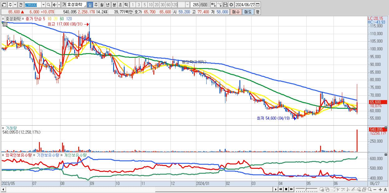 - 효성화학 (65,600원 ▲ 10.07% , 시총: 2,487억, 거래량: 540,095, 거래대금:398억)
