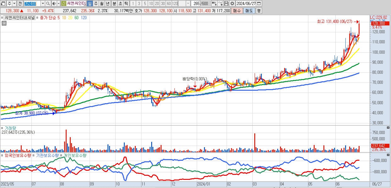 - 씨앤씨인터내셔널 (128,300원 ▲ 9.47% , 시총: 12,848억, 거래량: 237,642, 거래대금:301억)