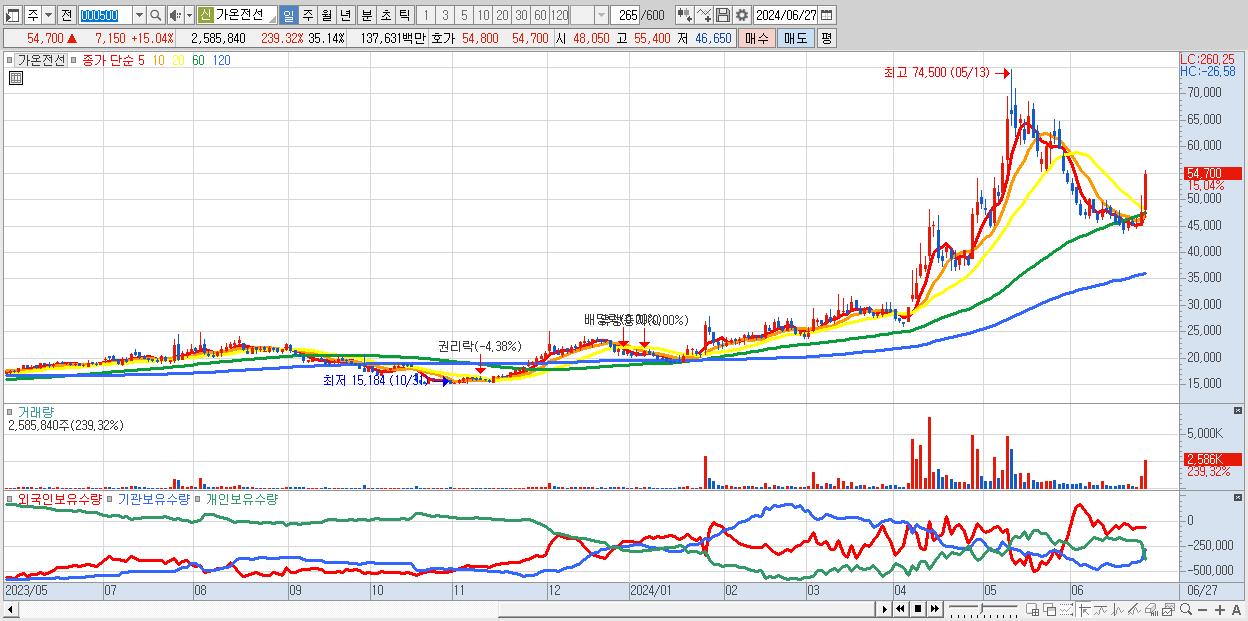- 가온전선 (54,700원 ▲ 15.04% , 시총: 4,025억, 거래량: 2,585,840, 거래대금:1,376억)