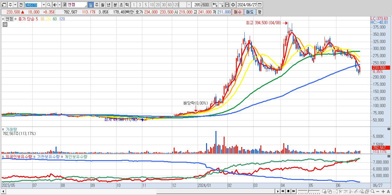 - 엔켐 (233,500원 ▲ 8.35% , 시총: 47,472억, 거래량: 782,567, 거래대금:1,785억)