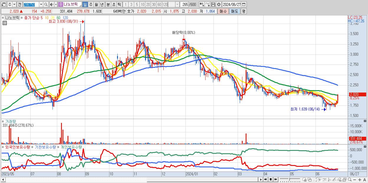- 나노브릭 (2,020원 ▲ 8.25% , 시총: 418억, 거래량: 331,484, 거래대금:6억)