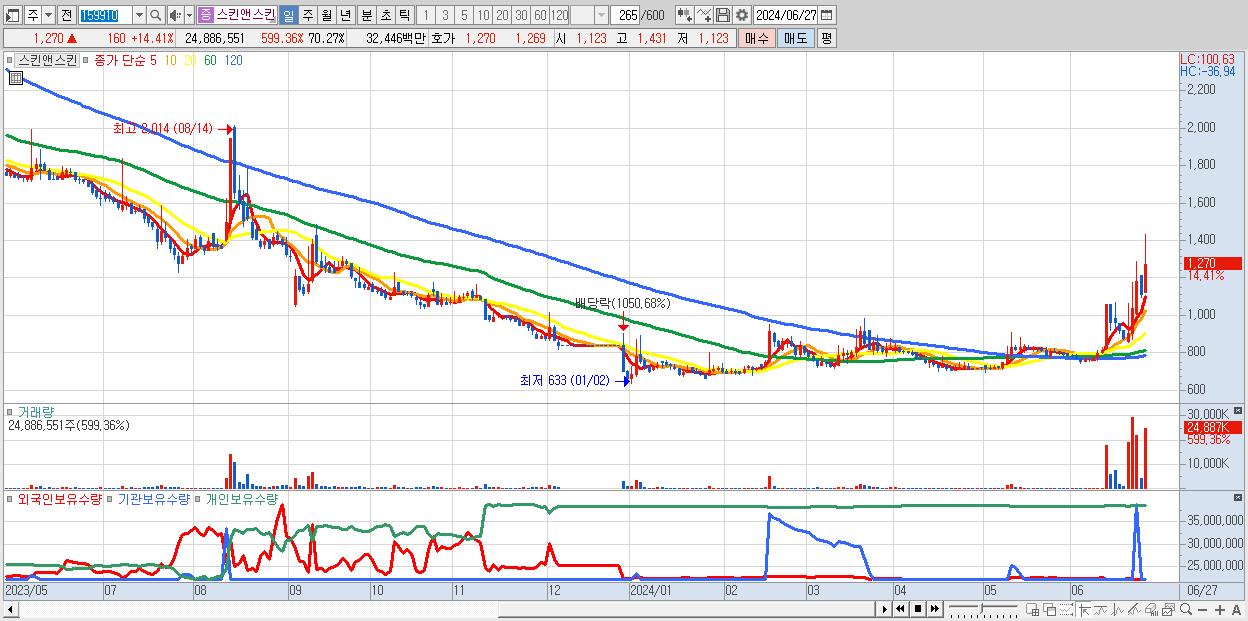 - 스킨앤스킨 (1,270원 ▲ 14.41% , 시총: 450억, 거래량: 24,886,551, 거래대금:324억)