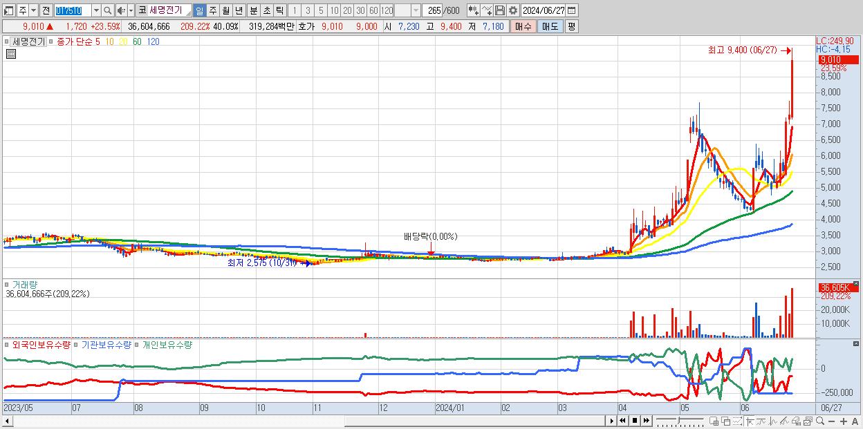- 세명전기 (9,010원 ▲ 23.59% , 시총: 1,374억, 거래량: 36,604,666, 거래대금:3,193억)