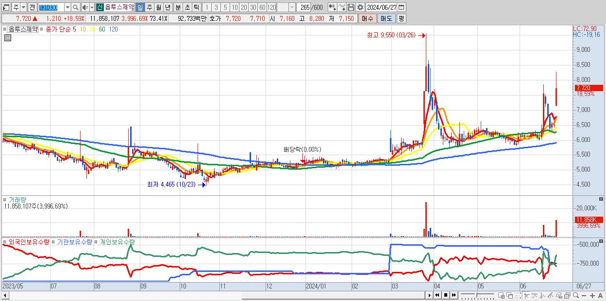 - 옵투스제약 (7,720원 ▲ 18.59% , 시총: 1,247억, 거래량: 11,858,107, 거래대금:927억)