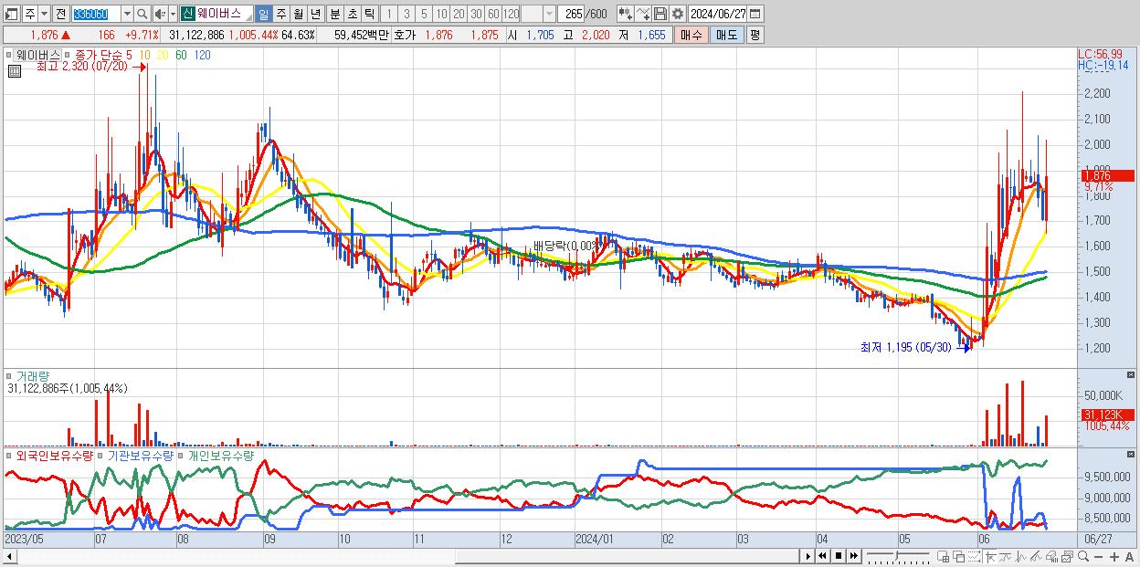 - 웨이버스 (1,876원 ▲ 9.71% , 시총: 903억, 거래량: 31,122,886, 거래대금:595억)