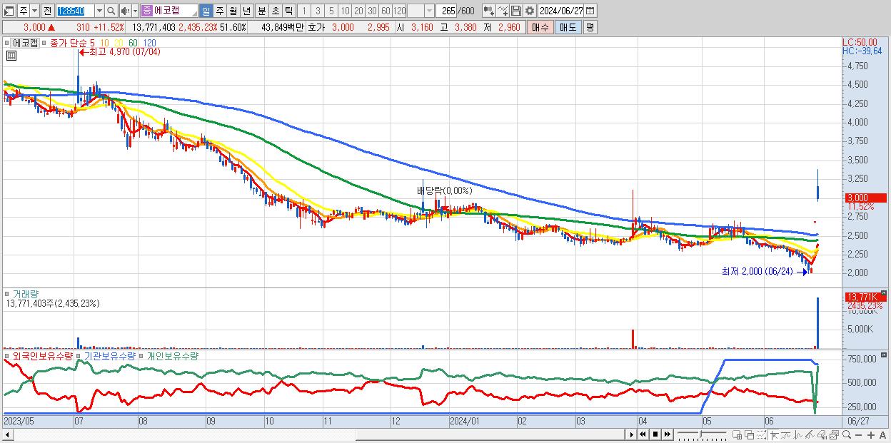 - 에코캡 (3,000원 ▲ 11.52% , 시총: 801억, 거래량: 13,771,403, 거래대금:438억)