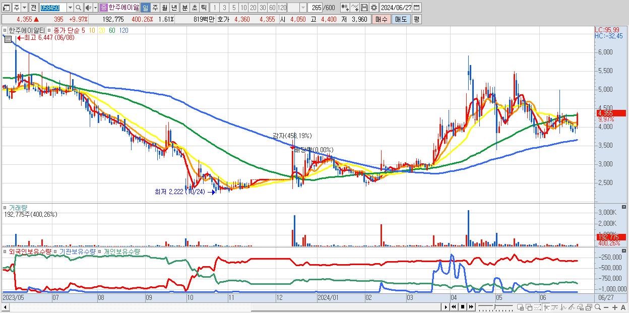 - 한주에이알티 (4,355원 ▲ 9.97% , 시총: 520억, 거래량: 192,775, 거래대금:8억)