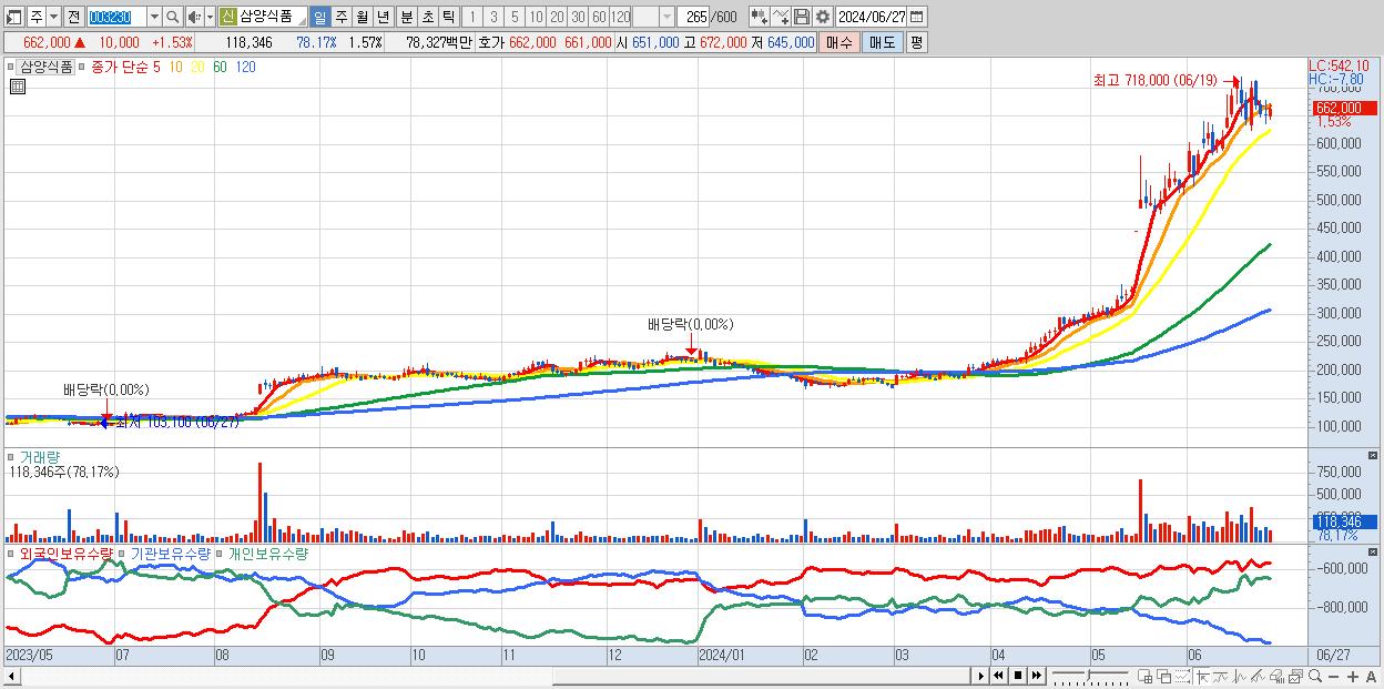- 삼양식품 (662,000원 ▲ 1.53% , 시총: 49,869억, 외국인 순매수 거래금:56억)
