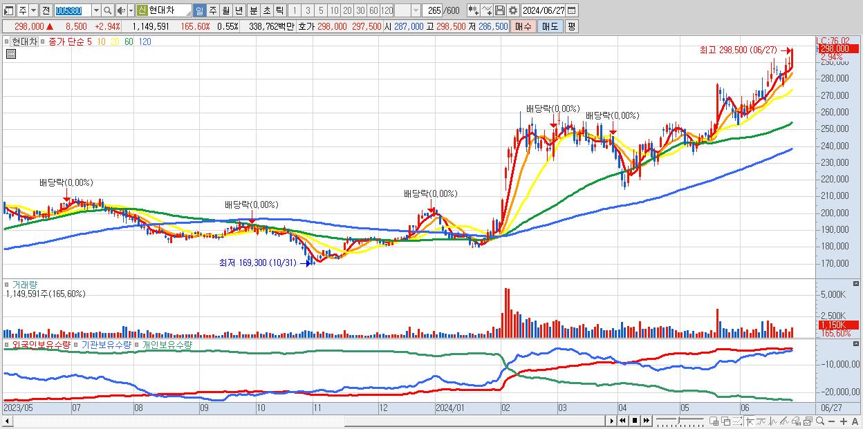 - 현대차 (298,000원 ▲ 2.94% , 시총: 624,060억, 외국인 순매수 거래금:547억)