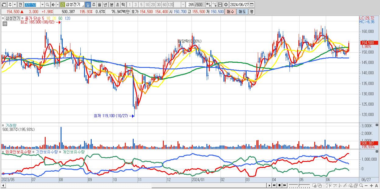 - 삼성전기 (154,500원 ▲ 1.98% , 시총: 115,402억, 외국인 순매수 거래금:424억)