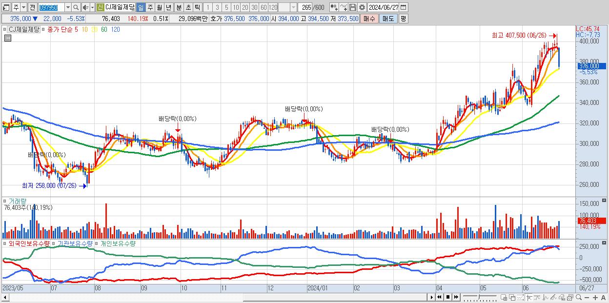 - CJ제일제당 (376,000원 ▼ -5.53% , 시총: 56,604억, 외국인 순매수 거래금:68억)