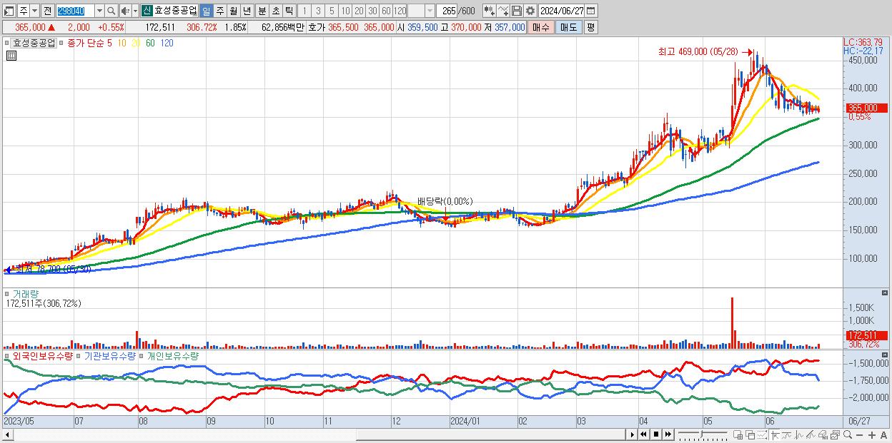 - 효성중공업 (365,000원 ▲ 0.55% , 시총: 34,035억, 외국인 순매수 거래금:101억)