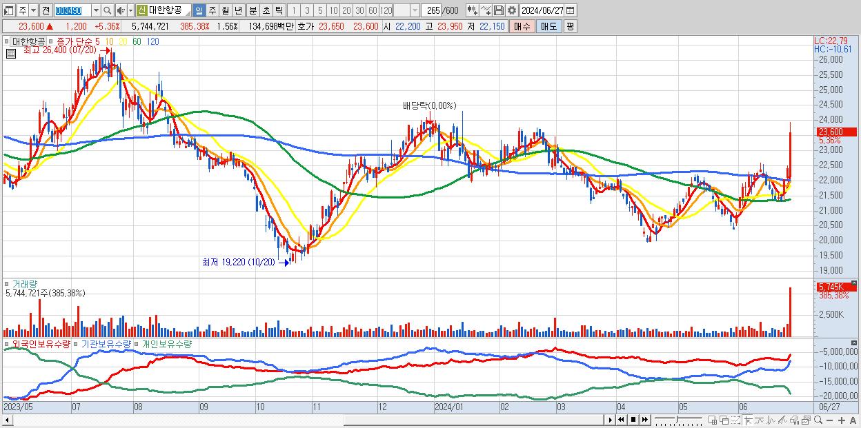 - 대한항공 (23,600원 ▲ 5.36% , 시총: 86,900억, 외국인 순매수 거래금:189억)