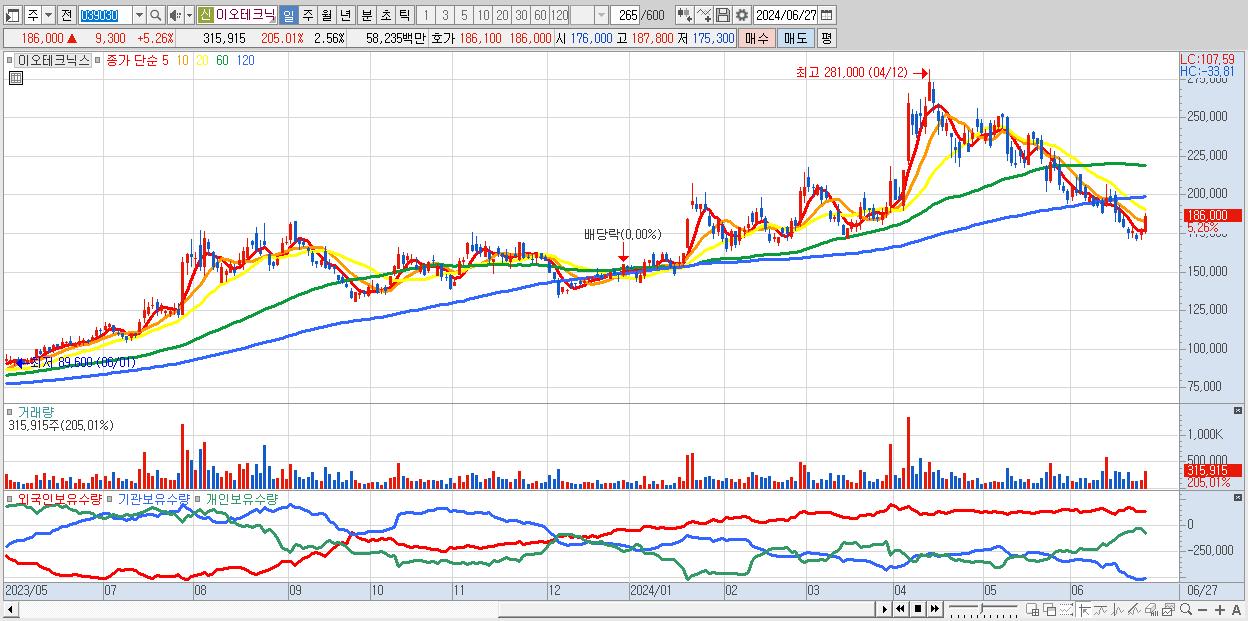 - 이오테크닉스 (186,000원 ▲ 5.26% , 시총: 22,914억, 외국인 순매수 거래금:75억)