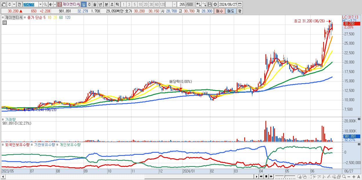 - 제이앤티씨 (30,200원 ▲ 2.2% , 시총: 17,470억, 외국인 순매수 거래금:53억)