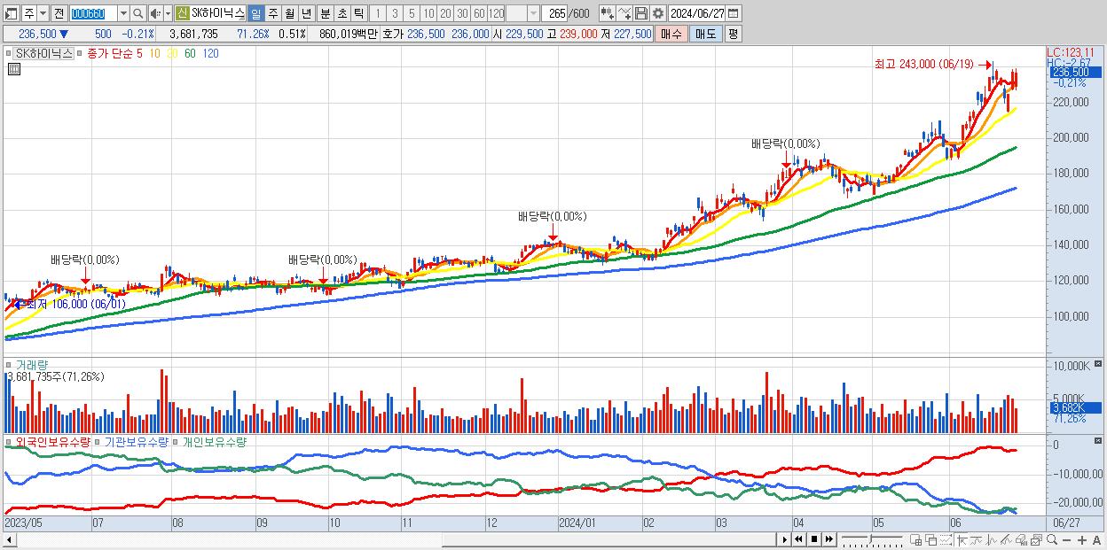 - SK하이닉스 (236,500원 ▼ -0.21% , 시총: 1,721,726억, 외국인 순매수 거래금:547억)