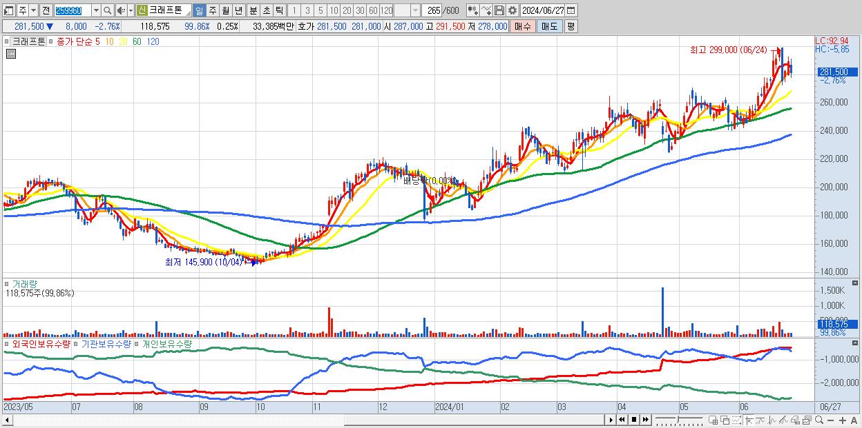 - 크래프톤 (281,500원 ▼ -2.76% , 시총: 134,808억, 외국인 순매수 거래금:61억)