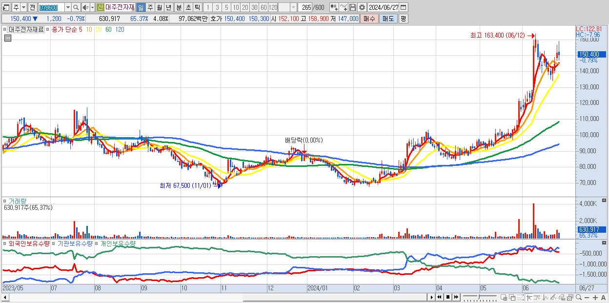 - 대주전자재료 (150,400원 ▼ -0.79% , 시총: 23,283억, 외국인 순매수 거래금:76억)