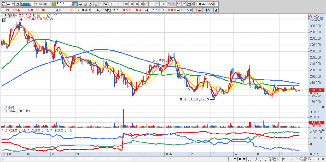 - 하이브 (198,500원 ▲ 0.3% , 시총: 82,679억, 외국인 순매수 거래금:160억)