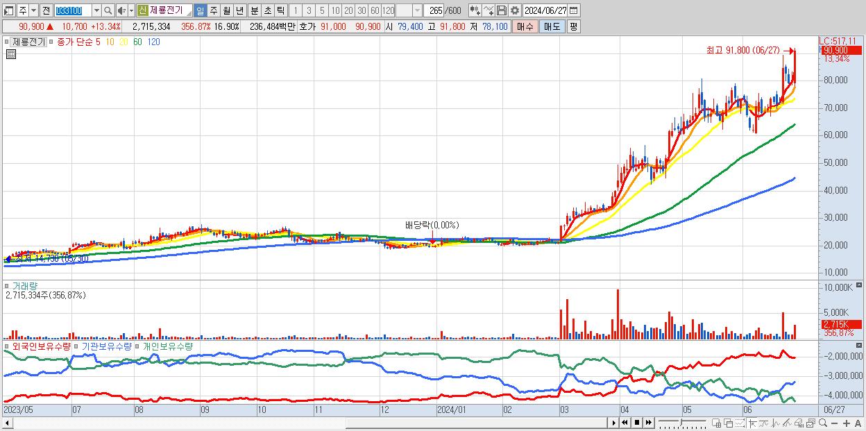- 제룡전기 (90,900원 ▲ 13.34% , 시총: 14,601억, 외국인 순매수 거래금:179억)
