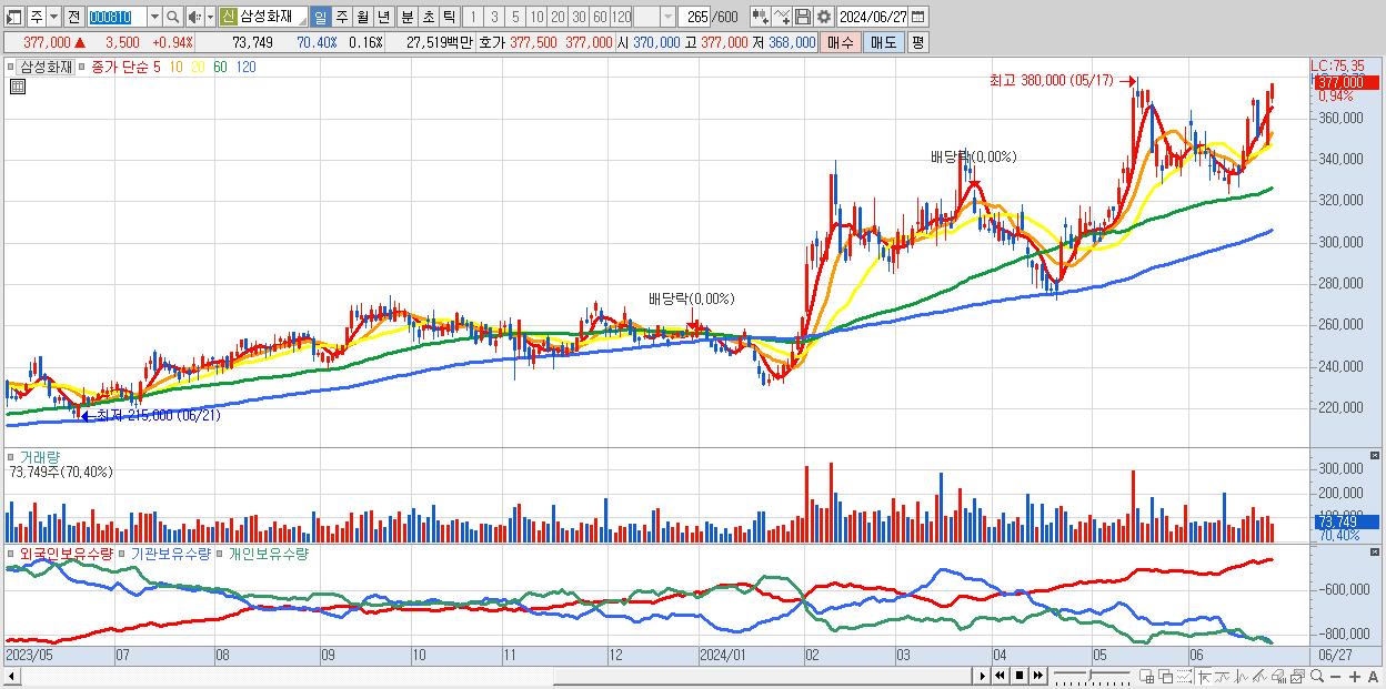 - 삼성화재 (377,000원 ▲ 0.94% , 시총: 178,603억, 외국인 순매수 거래금:95억)