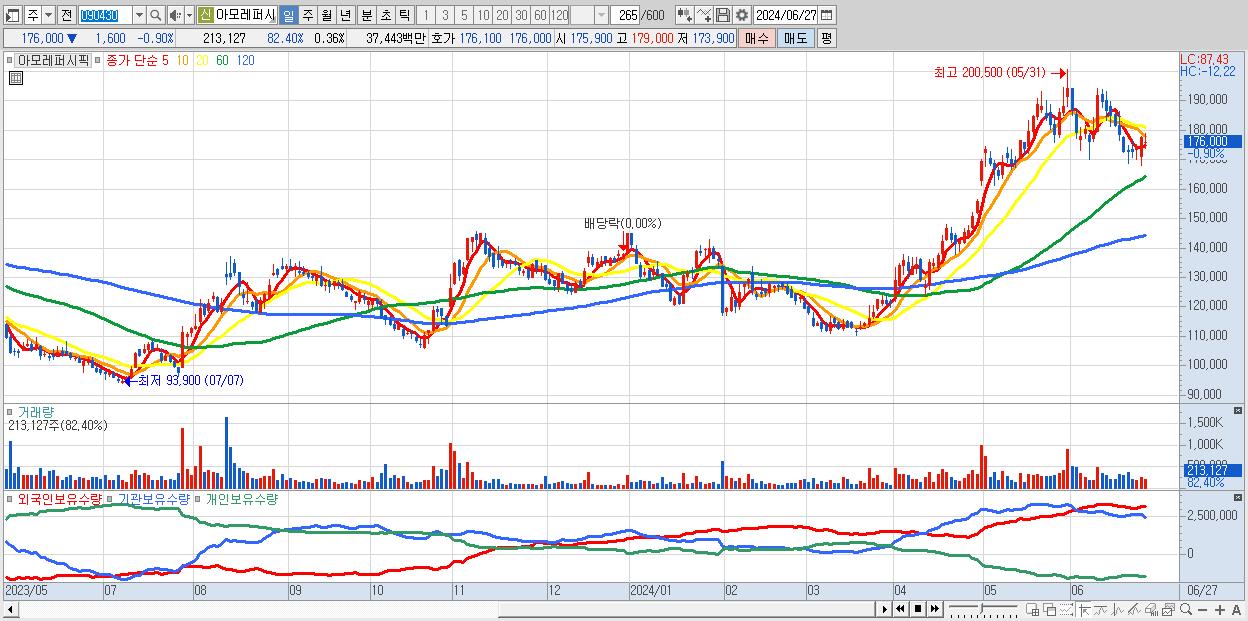 - 아모레퍼시픽 (176,000원 ▼ -0.9% , 시총: 102,947억, 외국인 순매수 거래금:121억)