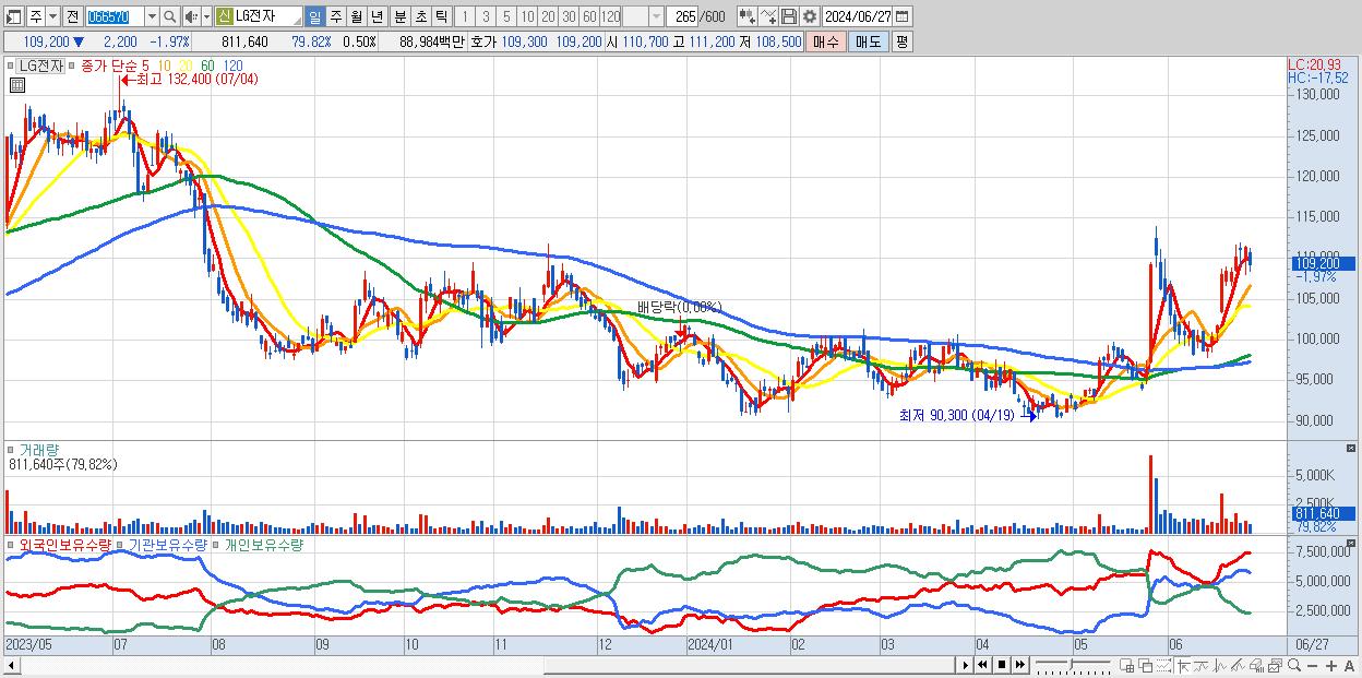 - LG전자 (109,200원 ▼ -1.97% , 시총: 178,703억, 외국인 순매수 거래금:101억)