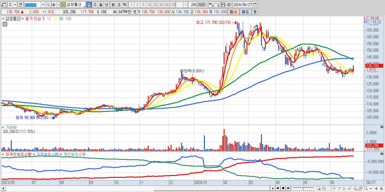 - 삼성물산 (138,700원 ▲ 1.91% , 시총: 246,587억, 외국인 순매수 거래금:188억)