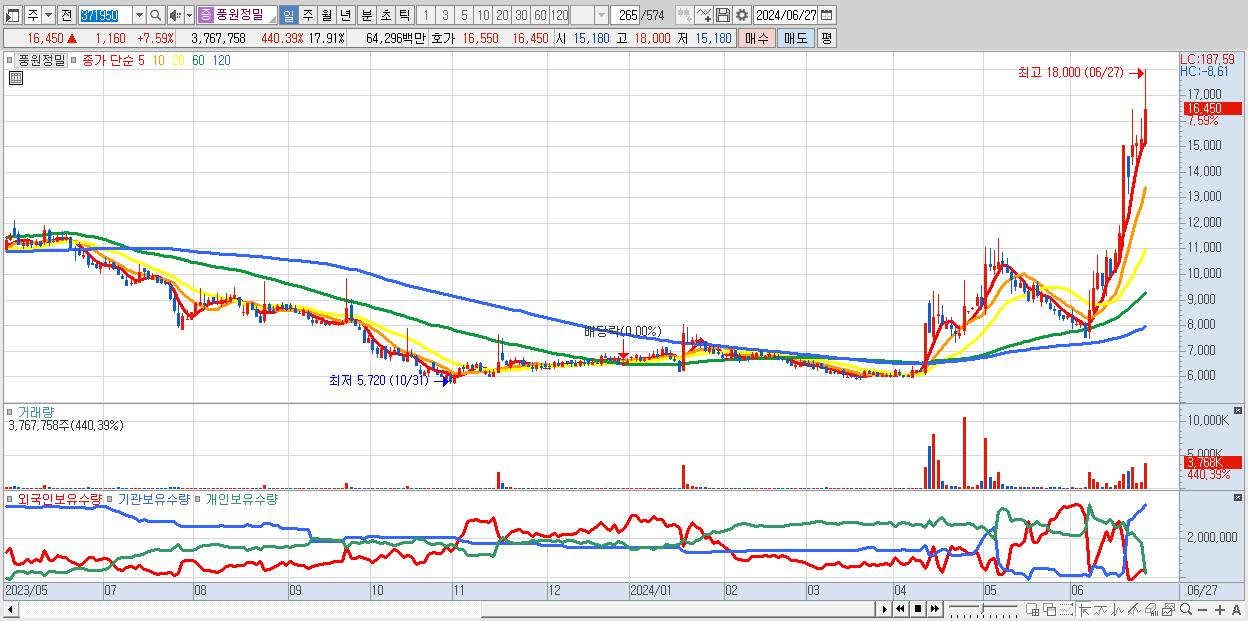 - 풍원정밀 (16,450원 ▲ 7.59% , 시총: 3,461억, 거래량: 3,767,758, 거래대금:643억, KOSDAQ)