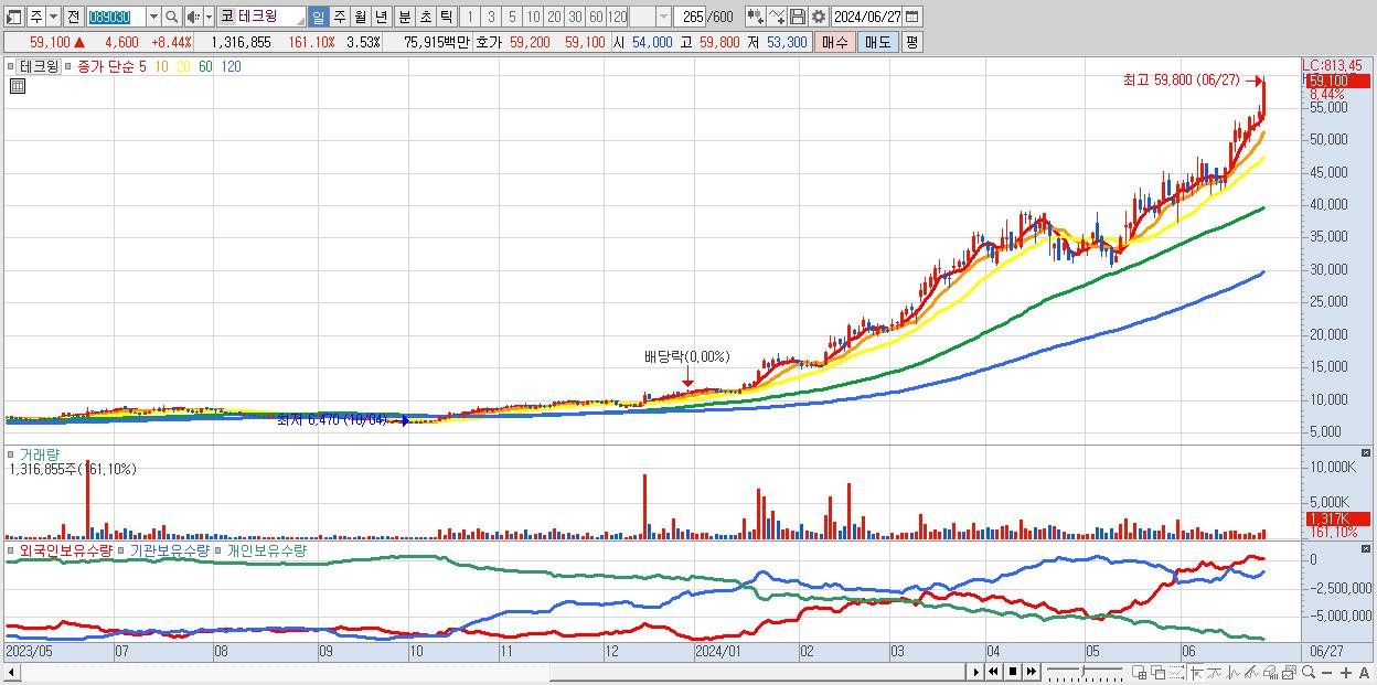 - 테크윙 (59,100원 ▲ 8.44% , 시총: 22,076억, 거래량: 1,316,855, 거래대금:759억, KOSDAQ)