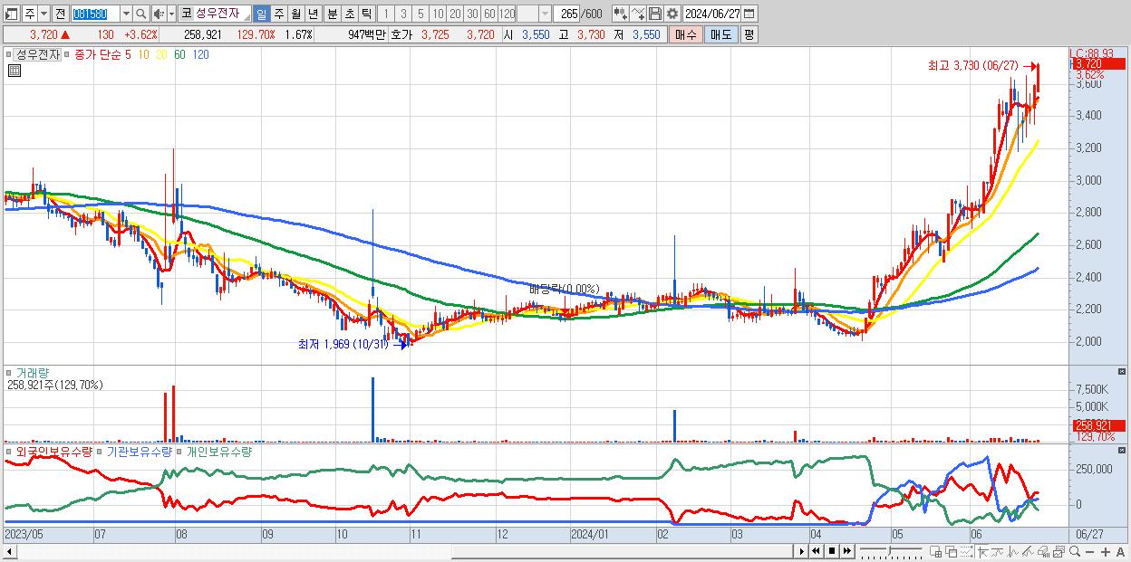 - 성우전자 (3,720원 ▲ 3.62% , 시총: 577억, 거래량: 258,921, 거래대금:9억, KOSDAQ)