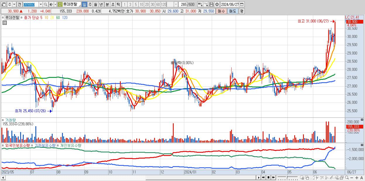 - 롯데렌탈 (30,900원 ▲ 4.04% , 시총: 11,320억, 거래량: 155,333, 거래대금:48억, KOSPI)