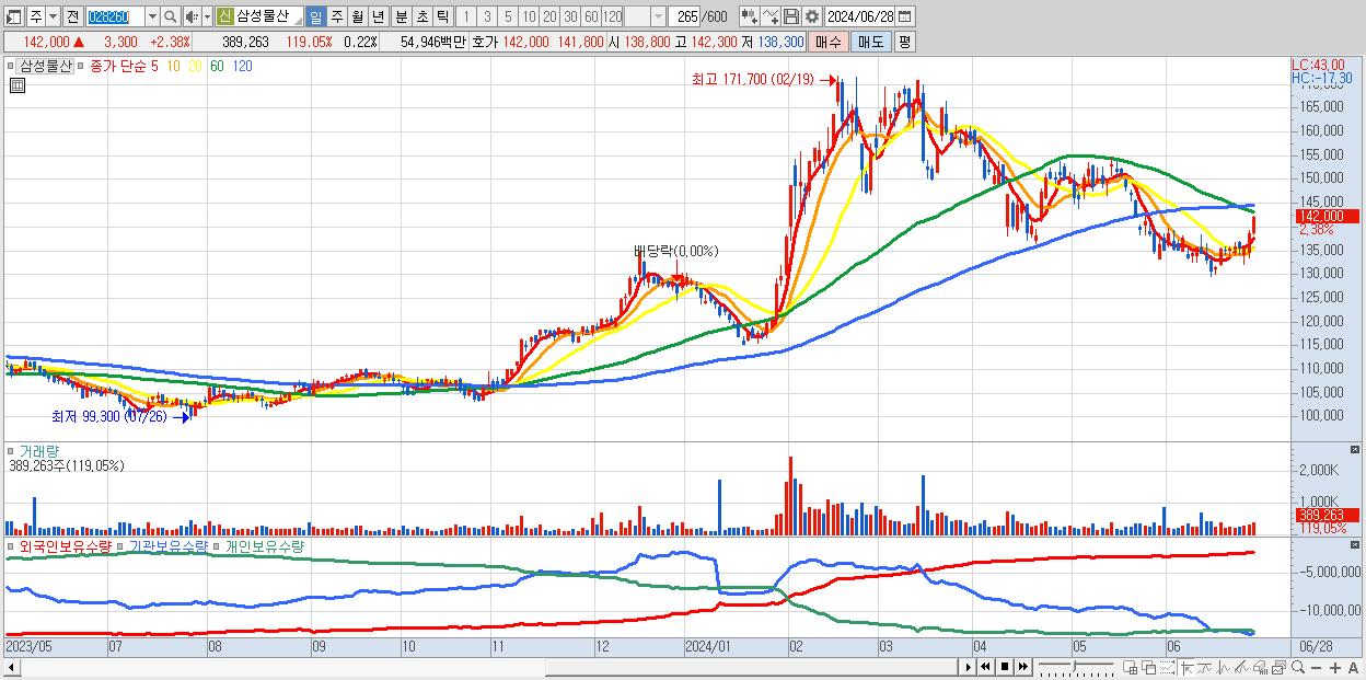 - 삼성물산 (142,000원 ▲ 2.38% , 시총: 252,453억, 외국인 순매수 거래금:87억)